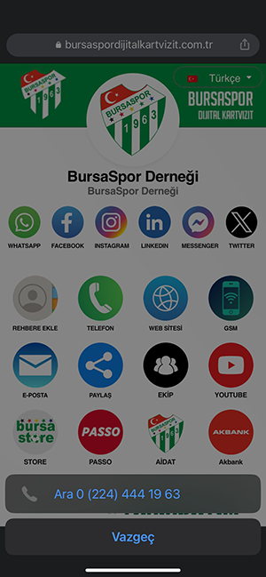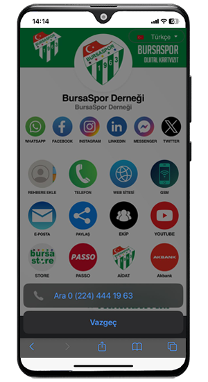 BursaSpor Dijital Kartvizit ile iletişime geç, iş bağlantılarınızla kolayca iletişim kurun ve iş dünyasında ağınızı genişletin.