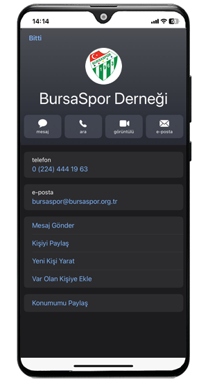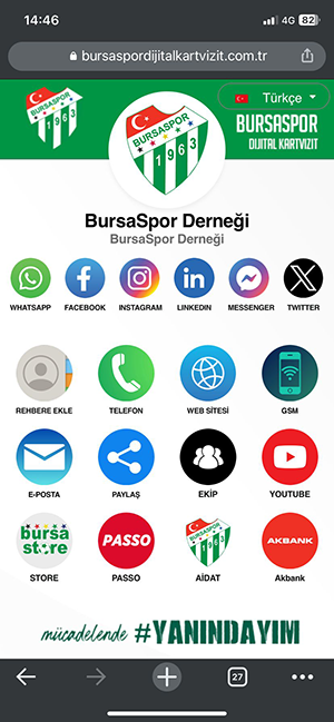 BursaSpor Dijital Kartvizit ile iletişime geç, iş bağlantılarınızla kolayca iletişim kurun ve iş dünyasında ağınızı genişletin.